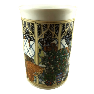 Features beautiful artwork wrapping around the exterior surface consisting of cats sitting in front of a window in a festive Christmas scene.