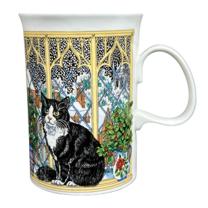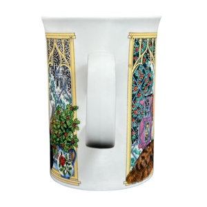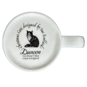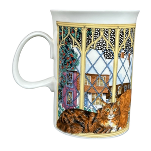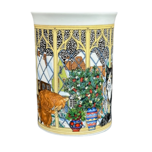 Features beautiful artwork wrapping around its exterior surface depicting cats sitting in front of windows with festive Christmas scenes behind them.