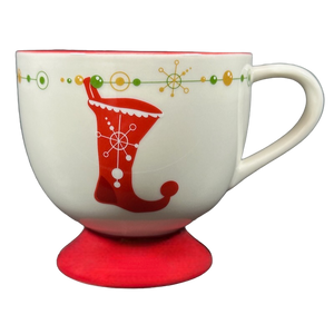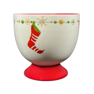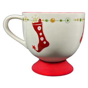 Features the same artwork on its front and rear surface. There is a red Christmas stocking hanging from a string of lights or ornaments.