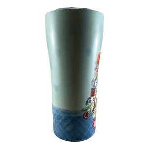 It features a colorful Christmas tree with a bird on top on its front surface.