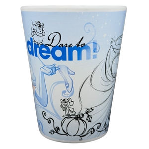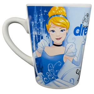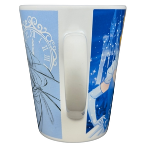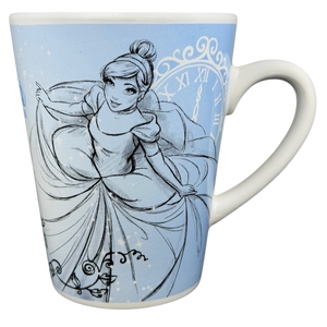 This elegant Disney Cinderella mug features a dreamy wraparound design that blends soft blue tones with a graceful pencil-style sketch of Cinderella alongside a vibrant full-color portrait set against her sparkling castle backdrop. Delicate details like the clock motif, whimsical mice illustrations, and the inspiring phrase “Dare to Dream” add storybook charm and visual depth to the design. Finished with a comfortable curved handle, smooth white glazed interior, and a licensed Galerie bottom mark indicating dishwasher and microwave safe use, this mug is a beautiful and inspiring collectible for fans of classic Disney fairy tales.