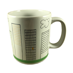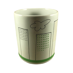 Features a hand drawn sketch of a city skyline with clouds above encircling the exterior surface.