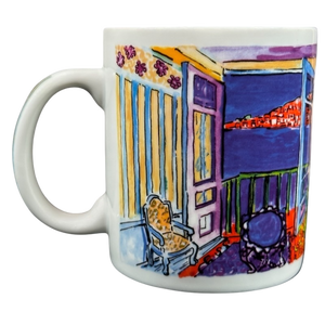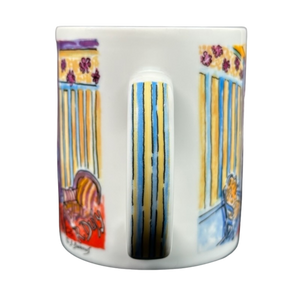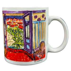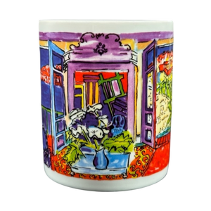 Features vibrant colorful artwork wrapping around its exterior surface and on the handle that depicts the view from inside a room of a French cityscape.