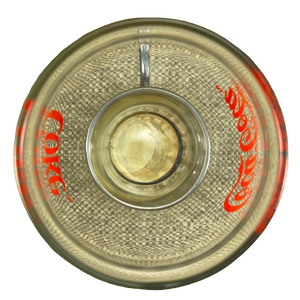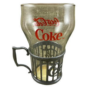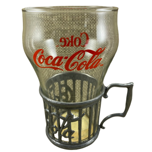 "Coca Cola" is written in a red cursive font on one side of the glass and "Coke" is written in a red block font on the opposite side.