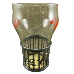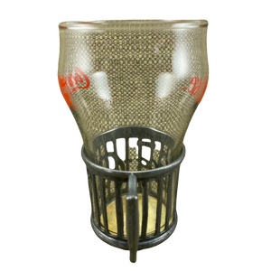 This vintage glass with pewter holder is composed of two separate sections that fit together.