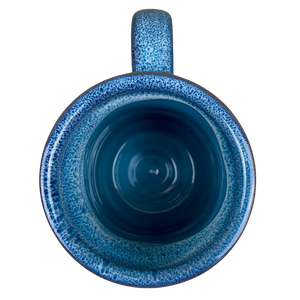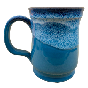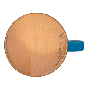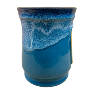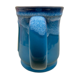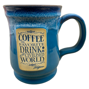 This is a beautiful hand thrown mug that features a raised plaque on its front surface that says the following: