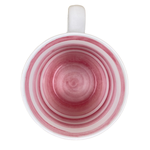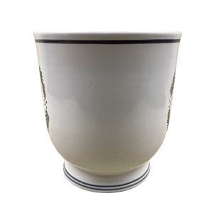 There is black trim wrapping around the upper surface on the exterior near the rim and also on the pedestal base and sides of the handle.