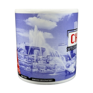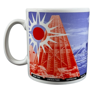 Features images and cities printed on it relating to Chicago wrapping around its exterior surface.