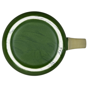 The smooth, matte exterior showcases deep forest tones with natural variation, giving the mug a hand-crafted, mountain-lodge feel. The handle is finished in a contrasting light tan, offering a comfortable grip while enhancing the rustic color palette. The interior continues the dark green tone, creating a cohesive, earthy aesthetic from top to bottom. The base is unmarked, keeping the focus on the artwork and the beautifully swirled glaze.