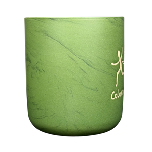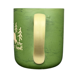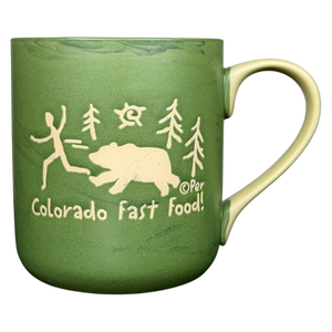 This Colorado-themed stoneware mug delivers rugged outdoorsy charm with a sharp sense of humor. Set against a textured green, marbled-style surface, the front design features a playful pictograph-style scene of a stick figure being chased by a bear, surrounded by tall pine trees and a bright sun. Beneath the illustration, the phrase “Colorado Fast Food!” adds the perfect comedic punch, making this mug an instant conversation starter.