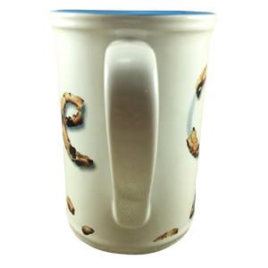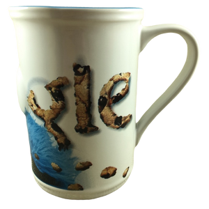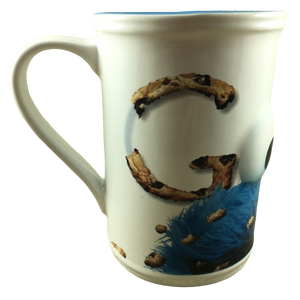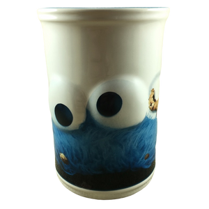 This is a very unique and larger than average mug that feature an image of Cookie Monster with embossed eyes wrapping around its exterior surface.