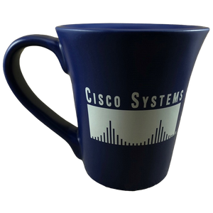 This mug has "Cisco Systems" printed on its front surface with their logo below it.