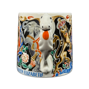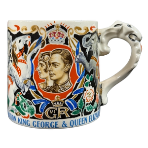 Features colorful artwork depicting celebrating the coronation of King George and Queen Elizabeth wrapping around its exterior surface.