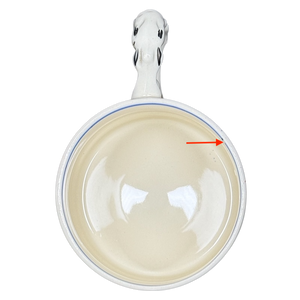 - There is a spot absent of the interior blue trim which wraps around the interior rim. Please see the red arrow pointing to this in the fifth photo.