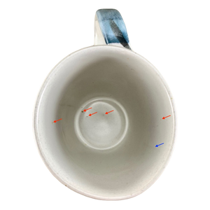 There are a few small brown stains inside this mug and a few similar ones on the exterior surface, please see the red arrows pointing to these in the 5th photo. There are some more, the arrows point to the more obvious ones on the interior .