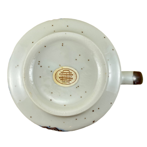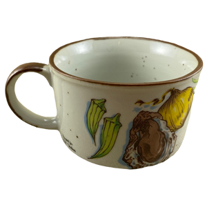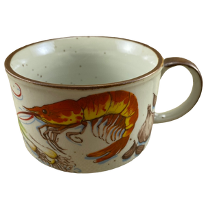 This is an oversized soup mug with a speckled finish that prominently features a large shrimp on its front surface.
