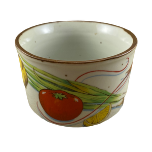 Surrounding this and wrapping around the rest of the exterior surface are assorted fruits and vegetables including garlic, lemon, green onion, tomato, and okra.