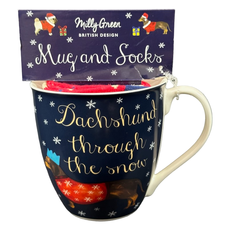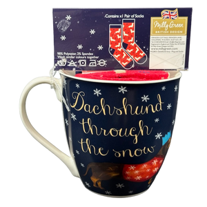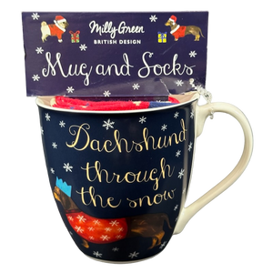 Also includes a pair of red socks with blue trim. There are tan dachshunds and blue snowflakes scattered about on the socks.
