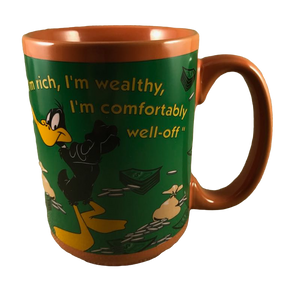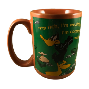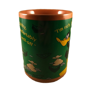 Features the same artwork on the front and the back of the mug consisting of Daffy Duck with the folllowing text above him, "I'm Rich, I'm Wealthy, I'm Comfortably Well-Off"