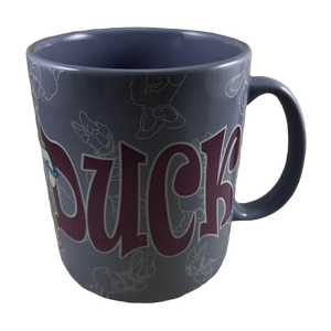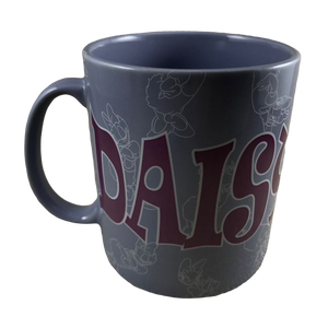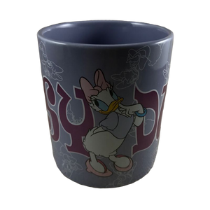 There are many line art drawings of Daisy duck scattered in the background wrapping around the exterior of this interesting mug.