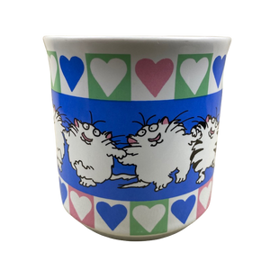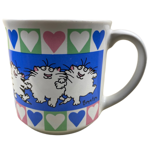 Above and below the cats is a row of blue, white, and pink hearts.