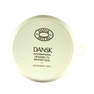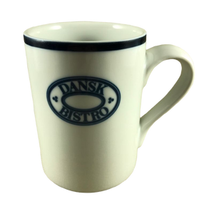 Features a Dansk Bistro logo on the front surface and a blue trim ring around the top just below the rim.