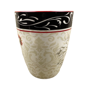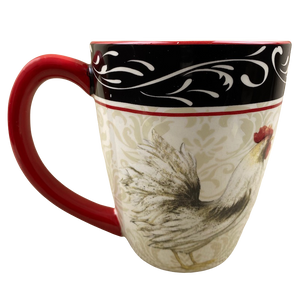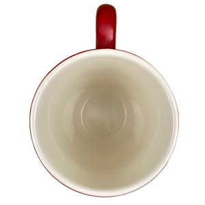 Theres a band of back and white trim on the upper surface with a red line below it that wraps completely mourned mug.
