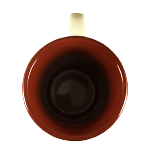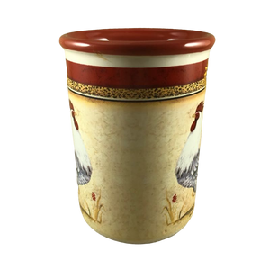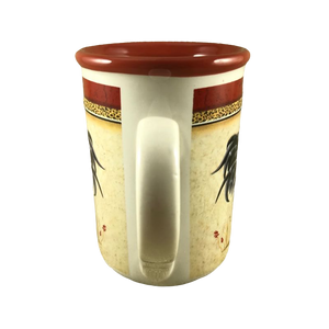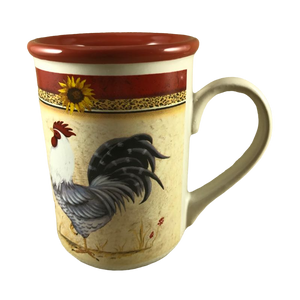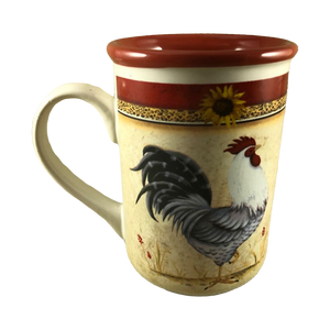Features the same artwork on the front and back of this mug consisting of a rooster with a sunflower above it.