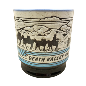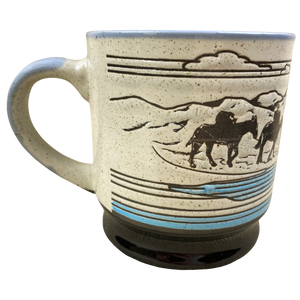 This is a beautiful mug that features etched artwork wrapping around its exterior surface.