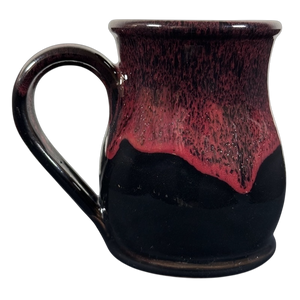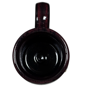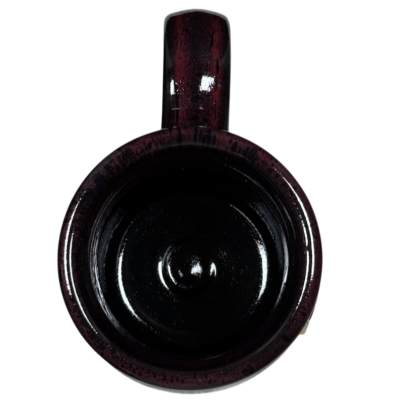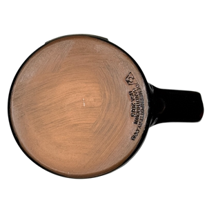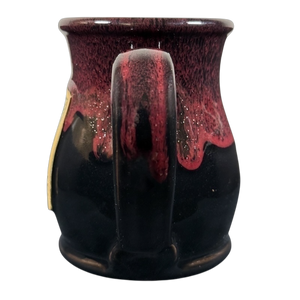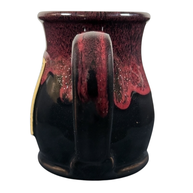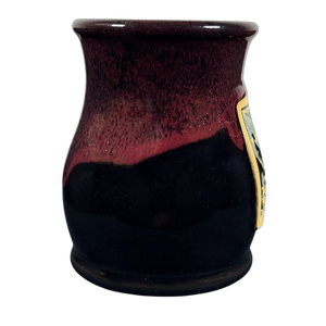 This is a hand thrown pottery mug that features a raised plaque on its front surface.
