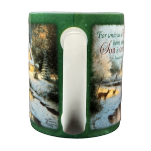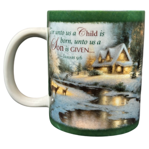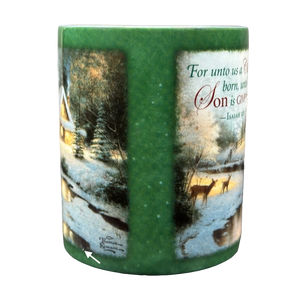 Features the same beautiful image of a snow covered cottage sitting along a lake with two deer on its front and rear surface.