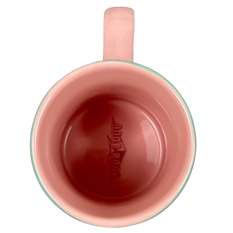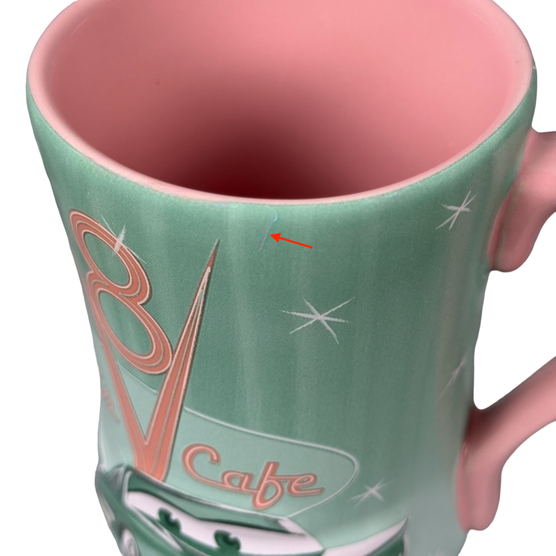There is a thin grooved line on the front upper surface near the rim. It reveals the pink surface below it resulting in a thin pink line, please see the red arrow pointing to this in the last photo.