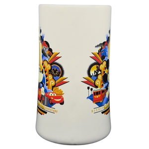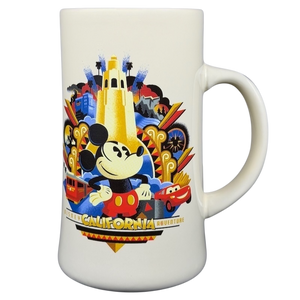 This vibrant Disney California Adventure mug features a bold, colorful graphic celebrating the park’s iconic attractions, with Mickey Mouse front and center against a dynamic collage that includes the Carthay Circle Theatre, classic trolley cars, palm trees, and Cars Land details. The tall, gently flared silhouette offers a comfortable grip with a sturdy handle, while the creamy off-white ceramic interior adds a warm, neutral contrast to the vivid exterior artwork. Finished with a Disney Parks price sticker on the base, this mug is a lively park souvenir that captures the energy and spirit of Disney California Adventure for collectors and everyday Disney fans alike.