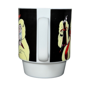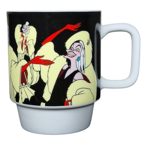This striking stackable Cruella de Vil ceramic mug brings the iconic Disney villain to life with bold, animated artwork wrapped around the exterior. Featuring Cruella in her signature fur coat, dramatic red gloves, and unmistakably wicked expressions, the design captures her larger-than-life personality in vivid detail against a deep black background. The glossy finish enhances the sharp colors and clean lines, while the sturdy white base and handle provide a comfortable, reliable feel for everyday use. Perfect for Disney fans, animation lovers, and collectors of classic villain memorabilia, this mug adds a touch of attitude and retro charm to every sip.