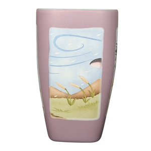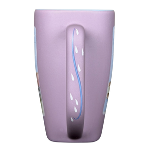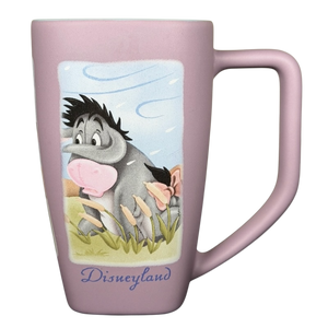 This pastel purple Disneyland mug features a tender illustration of Eeyore in a soft, breezy landscape, capturing his gentle and thoughtful nature. The tall, tapered shape and matte finish give it a smooth, modern look, while the handle is accented with a raindrop and swirl design that matches the windy scene. Inside on the rear upper surface is the charming quote, “Another blustery day,” adding a sweet hidden detail that fans will appreciate. With scenic artwork on all sides, this mug brings a calm, storybook feel to every sip—perfect for anyone who loves Eeyore’s quiet, lovable spirit.