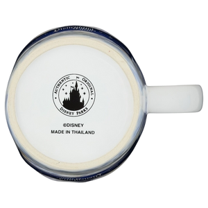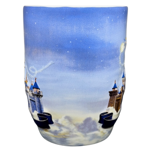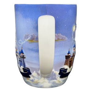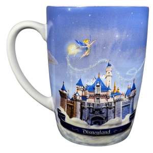 This enchanting Disneyland mug features a dreamy wraparound scene of Sleeping Beauty Castle set against a soft twilight sky, with Tinker Bell flying overhead and leaving a trail of shimmering pixie dust that brings the artwork to life. The rich blue tones, glowing castle details, and gentle cloud accents create a magical nighttime atmosphere, complemented by a comfortable curved handle and a subtly flared silhouette. Finished with a smooth white glazed interior and an Authentic Disney Parks bottom stamp, this mug is a beautiful collectible that captures the timeless magic of Disneyland in a serene, storybook style.