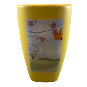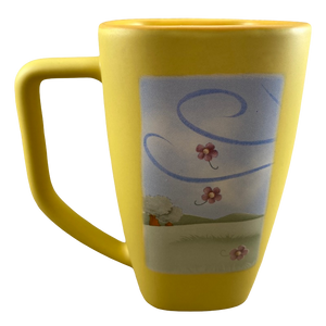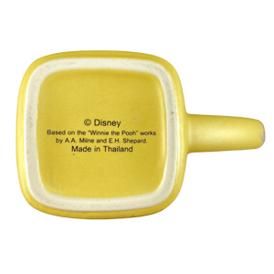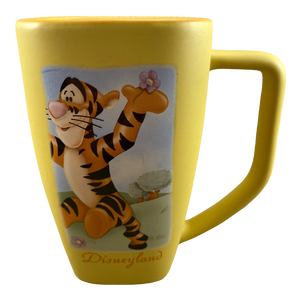 This is a square mug that features an image on the front surface of Tigger holding a purple flower.