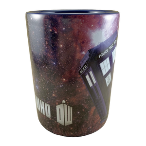 Features artwork wrapping around its exterior surface depicting the Tardis from Doctor Who.
