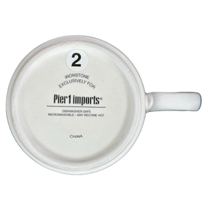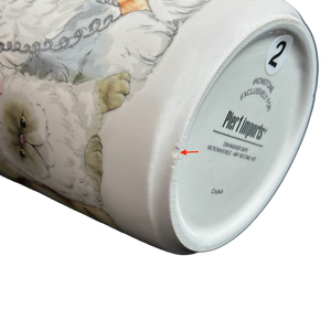 Copy 2: This mug is pre-owned and reconditioned. This mug has no chips, cracks, scratches, stains or crazing. There are two nicks on the bottom rim, please see the red arrows pointing to these in the last two photos. Price reduced to reflect these imperfections.