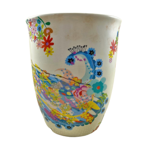 There's a large colorful peacock on the rear surface which wraps around to the side opposite the handle.