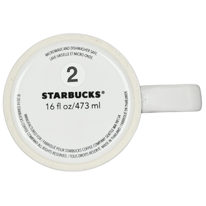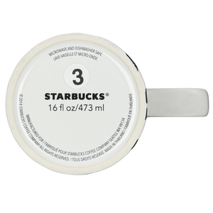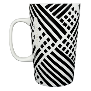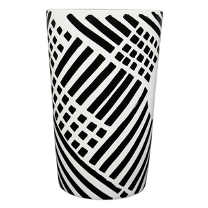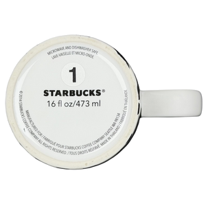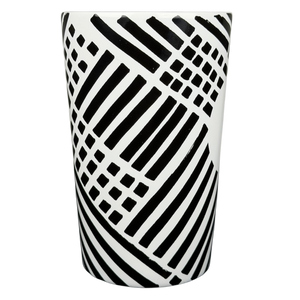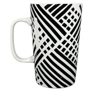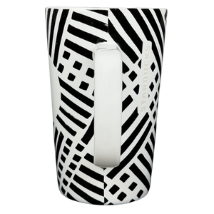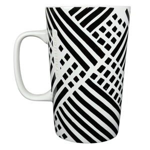 This modern Starbucks ceramic mug features a striking black-and-white geometric pattern of bold lines and grid elements that wrap around the exterior, creating a graphic, contemporary look against the smooth white glaze. The tall, gently tapered silhouette offers a comfortable grip and a generous 16-ounce capacity, making it ideal for everyday coffee or tea. Finished with subtle vertical Starbucks branding near the handle, a clean white interior, and a bottom stamp confirming authenticity, this 2015 Starbucks mug is microwave and dishwasher safe and makes a stylish addition to any modern mug collection.