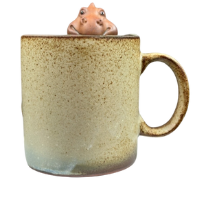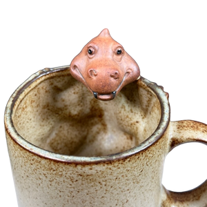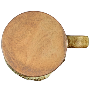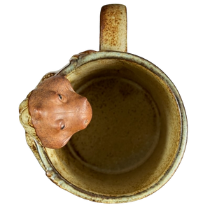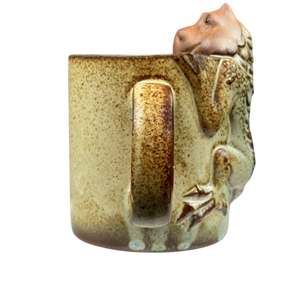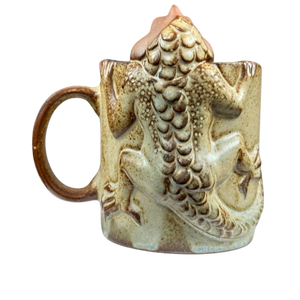 This is a unique vintage mug that features a 3D figural dragon or perhaps lizard peering over the rim of the mug.