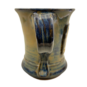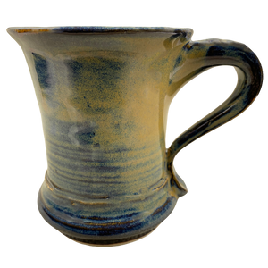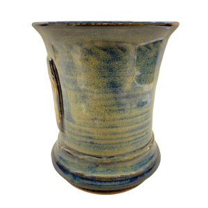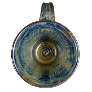This is a hand thrown mug with a beautiful finish in shades of green and blue mixed with a bit of brown.
