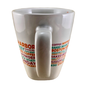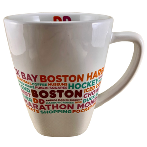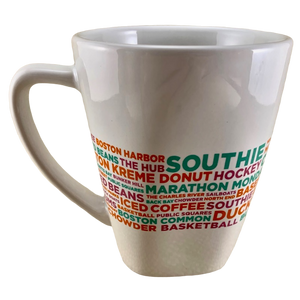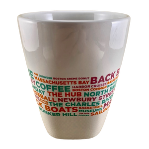 Features words in assorted colors relating to Boston wrapping around its exterior surface.