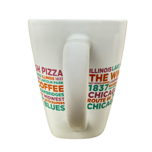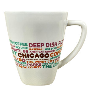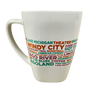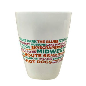 Features words in assorted colors relating to Chicago wrapping around its exterior surface.