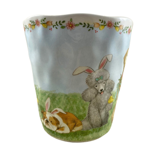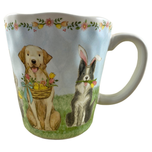 Features 4 different breeds of dogs wearing Easter attire wrapping around its exterior surface.