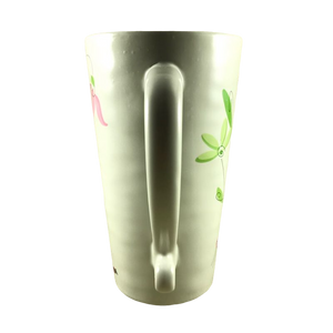 Beautiful tall mug has the same artwork on the front and back consisting of Eeyore holding 2 flowers in his mouth with very long stems.