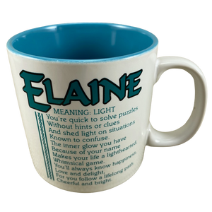 Features the name ELAINE printed in a large font at the top of the front side of the mug. Directly underneath this is a poem about the name ELAINE.