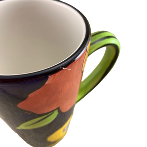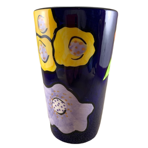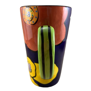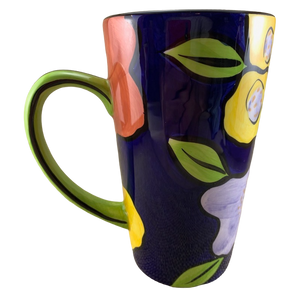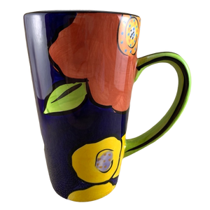 This is a tall mug that features colorful floral artwork wrapping around its exterior surface.