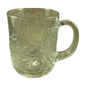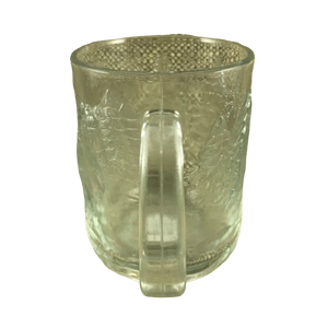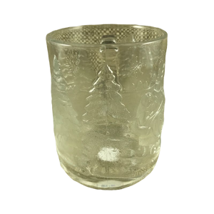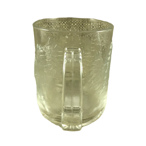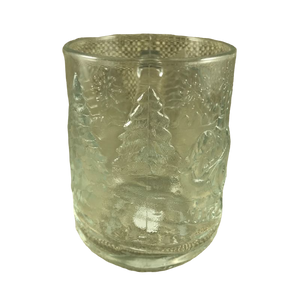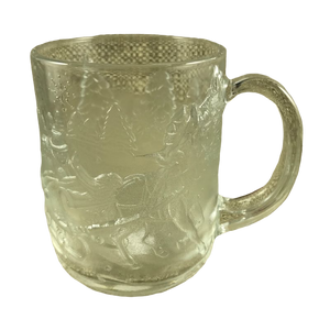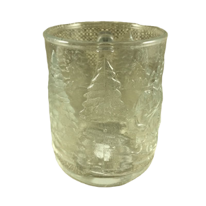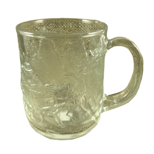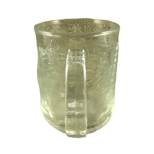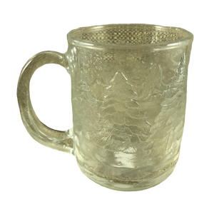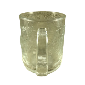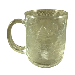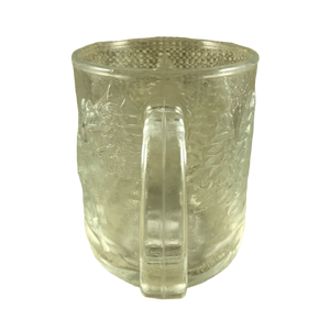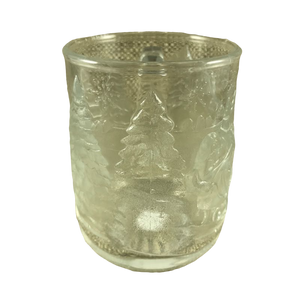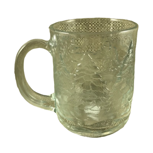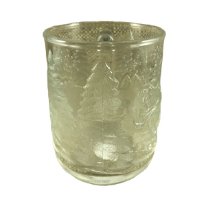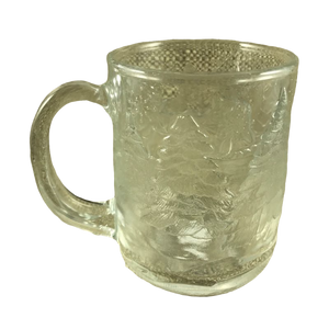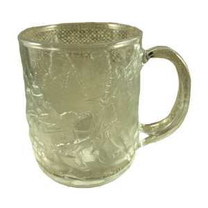 This is a clear glass mug featuring embossed artwork consisting of a horse drawn sleigh being pulled through a forest of trees.